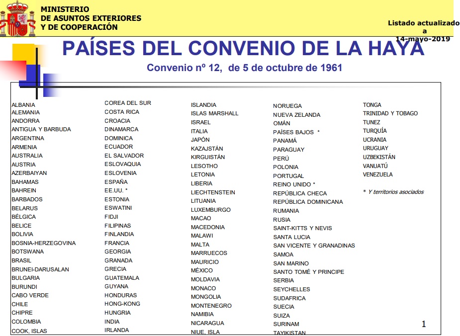 El listado de países firmantes del Convenio de la Haya son los siguientes: