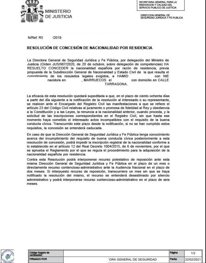 En esta ocasión, a Hamid le tocó esperar un poco más de la cuenta, pues contaba con antecedentes penales. Por suerte, los pudimos cancelar a tiempo y ha conseguido su ansiada y merecida nacionalidad española en fecha del anterior 22 de febrero de 2021.