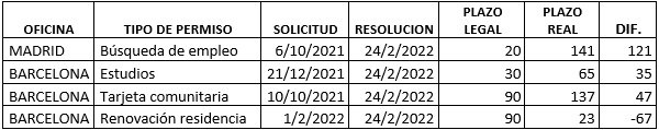 Como pueden ver en el cuadro que hemos elaborado para su fácil entendimiento, en estos momentos, las oficinas de extranjería no están dando cumplimiento a la legalidad vigente, es decir, no están resolviendo los expedientes dentro de los plazos legalmente establecidos (por regla general). Como excepción vemos que las oficinas de extranjería resuelven con mayor agilidad las renovaciones de residencia y trabajo y las tarjetas de residencia permanente que también se resuelven muy rápidamente.