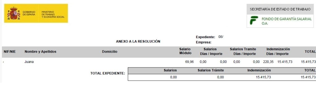 Este es el anexo de la resolución de concesión de la indemnización reconocida por el FOGASA: