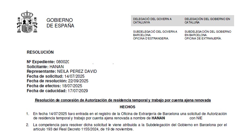 En fecha 14/07/2025 presentamos la solicitud re renovación, dejando pagadas las tasas y 22/09/2025 fue concedida la renovación de residencia y trabajo por 4 años más. En total el trámite demoró en Barcelona poco más de dos meses:
